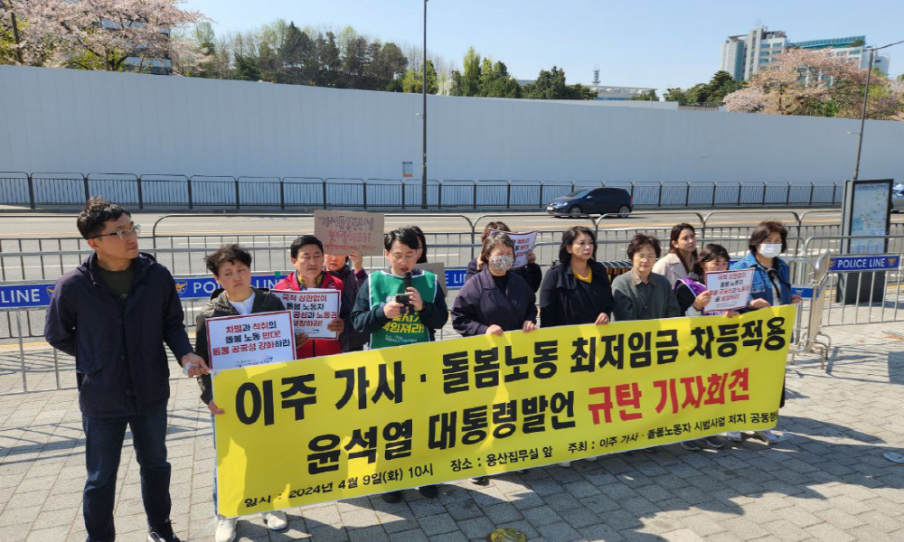 윤석열 대통령의 이주 가사·돌봄노동 최저임금 차등적용 발언에 대한 규탄의 목소리가 높아지고 있다. 공공운수노조 서울시사회서비스원지부는 9일 용산 대통령 집무실 앞에서 기자회견을 열고, 이주 가사-돌봄노동자에 대한 차별 정책의 철회를 강력히 요구했다.