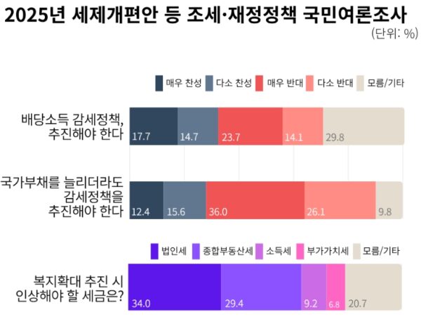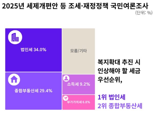 이재명 정부의 첫 세제개편안이 발표된 가운데, 국민 여론은 복지 확대를 위해 법인세와 종합부동산세(종부세) 등 증세를 우선해야 한다는 의견이 압도적인 것으로 나타났다.