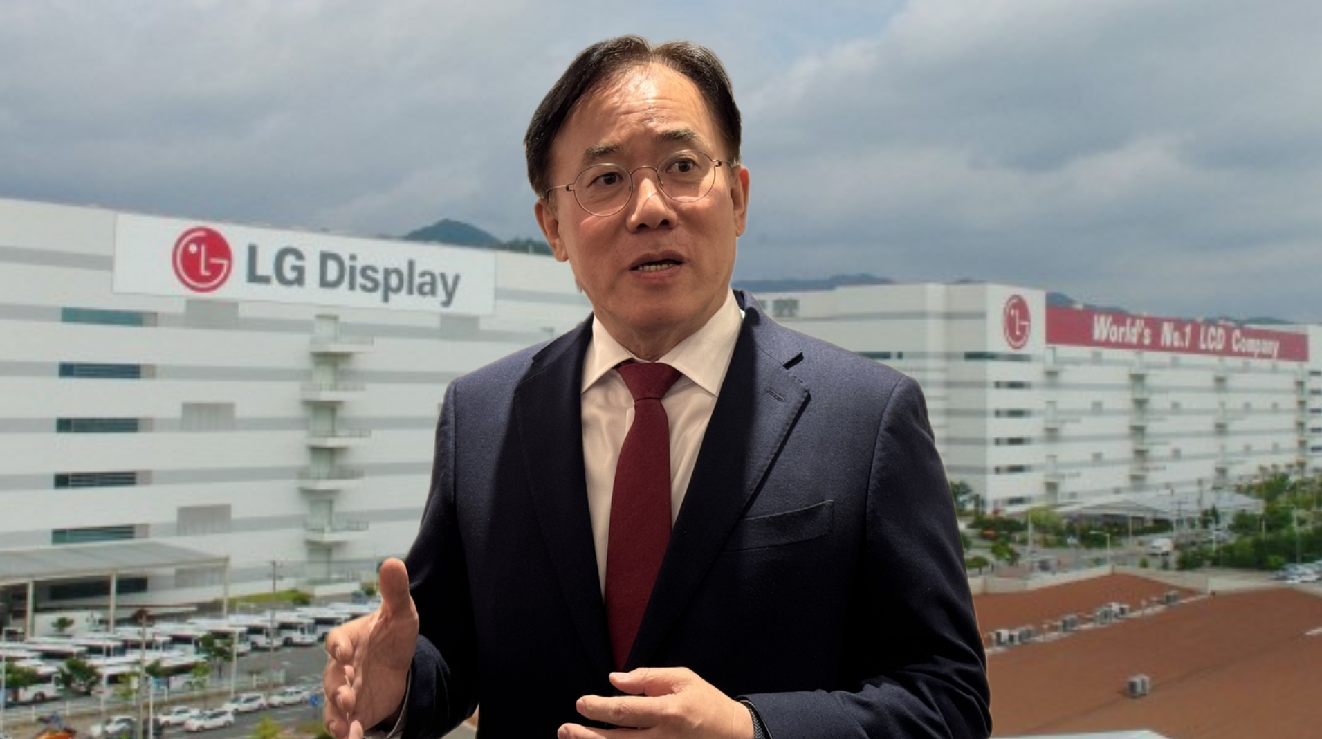 정철동 LG디스플레이 대표이사 사장과 LG디스플레이 구미사업장 전경. 그래픽=뉴스필드