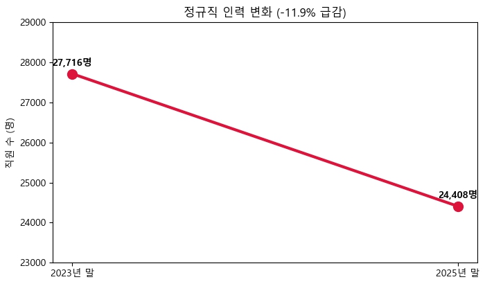2023년 말 2조 2,692억 원이었던 연간 급여 총액은 2025년 말 2조 1,378억 원으로 약 5.8%(약 1,314억 원) 감소했다. 이는 정규직 인력을 2년 새 11.93%(3,308명)나 감축한 결과다.