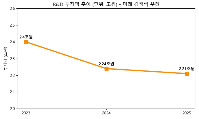 OLED 시장의 글로벌 경쟁이 치열해지는 긴박한 상황에서 미래 경쟁력을 담보하는 핵심 동력인 연구개발(R&D) 투자액이 3년 연속 감소하여, 2023년 2.40조 원에서 2025년 2.21조 원으로 위축되었음을 보여준다. 자료=금융감독원 공시시스템, 그래픽=뉴스필드