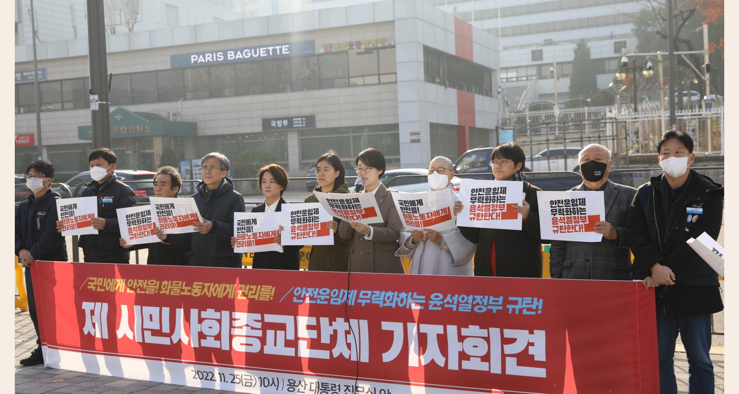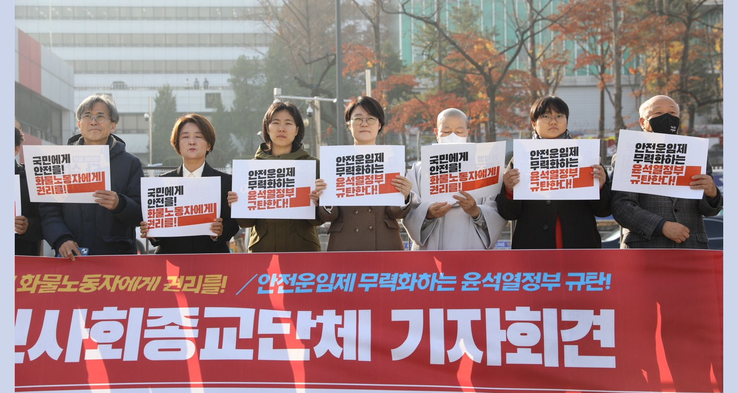 윤 상임대표는 이날 오전 용산 대통령 집무 프레스센터에서 화물노동자 총파업 지지 시민사회종교단체 공동 기자회견에 참석해 “정부는 대기업 편드는 개악안을 들고 나와 노동자들이 떼를 쓴다고 하고 있으나 떼를 쓰는 건 윤석열 정부”라며 이같이 밝혔다.