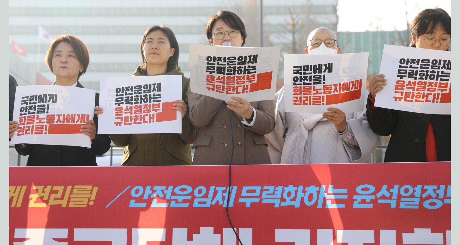 윤 상임대표는 “정부와 여당이 제시한 ‘화주책임 삭제’ 한 안전운임제 3년 연장은 대기업의 책임을 회피하도록 돕고, 사실상 안전운임제를 없애는 것과 같다”며 “정부는 대기업 편드는 개악안을 들고 나와 노동자들이 떼를 쓴다고 하고 있지만, 정작 떼를 쓰는 건 윤석열 정부”라고 비판했다.