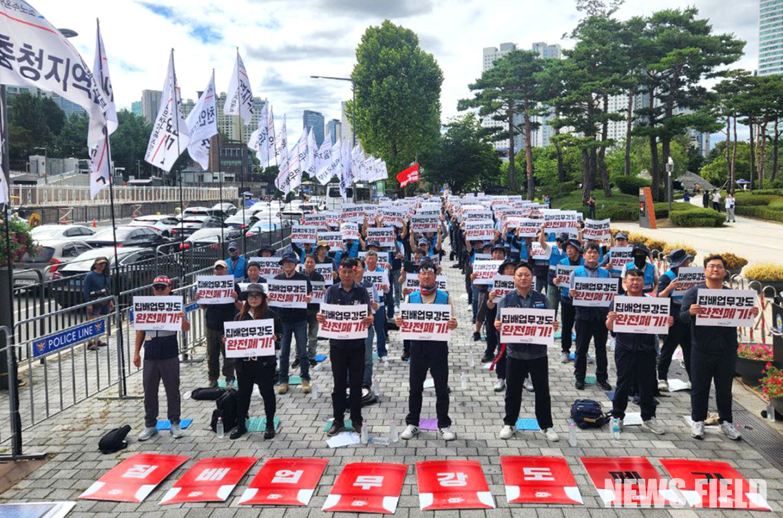 공공운수노조 전국민주우체국본부는 13일 오후 2시 서울 용산 대통령실 앞에서 “산재왕국 우정사업본부 규탄! 집배업무강도 폐기! 겸배 철폐!” 전 조합원 결의대회를 개최했다. 이들은 우정사업본부의 ‘집배업무강도’ 시스템이 집배원들의 산업재해를 유발하고 있다고 규탄하며, 정부에 제도 폐기를 강력하게 요구했다.