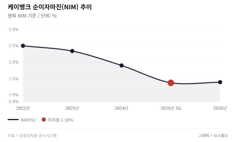 케이뱅크 측은 “예치금이 이탈하더라도 유동성커버리지비율(LCR)은 오히려 182%에서 700% 수준으로 상승하는 구조”라며 유동성 리스크는 제한적이라는 입장이다. 이는 대출 자원으로 쓰지 못하는 예치금이 빠질 경우 오히려 유동성 지표가 개선되는 역설적 구조 덕분이다.케이뱅크 최우형 행장수익성 지표인 순이자마진(NIM)은 3년 연속 하향 곡선을 그리고 있다. 2022년 2.51%였던 명목 NIM은 2025년 3분기 1.38%로 저점을 찍은 뒤 연간 1.40%를 기록했다.