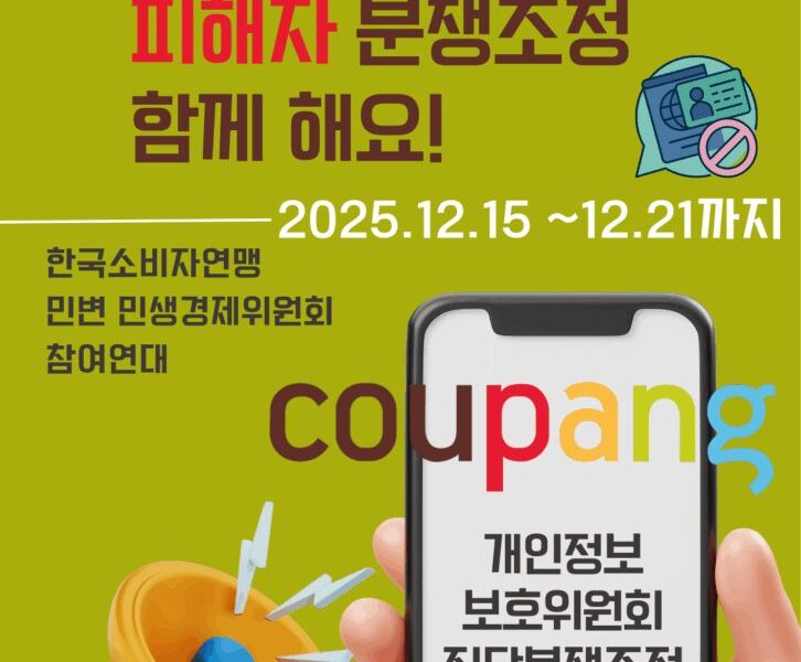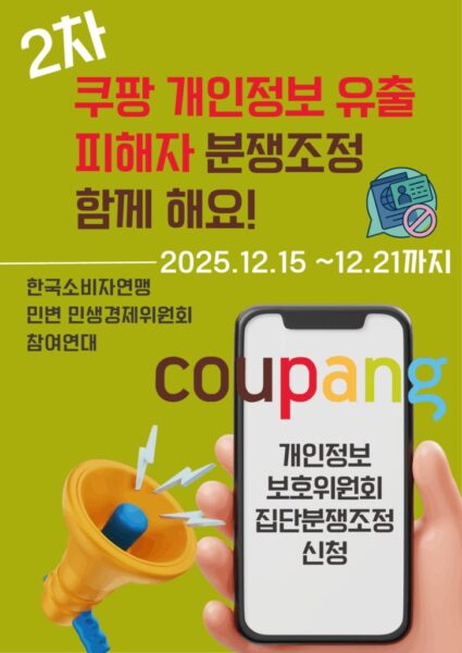 쿠팡 개인정보 유출 사태와 관련하여 참여연대, 한국소비자연맹, 민변 민생경제위원회 등 시민단체들이 2차 집단자율분쟁조정 신청자(▲집단분쟁조정 참가 신청서 작성 ▲집단분쟁조정 신청서 양식 다운로드) 나섰다. 이들 단체는 쿠팡 경영진의 책임 있는 사과와 재발 방지 대책 마련을 강력히 촉구한다고 12일 밝혔다.