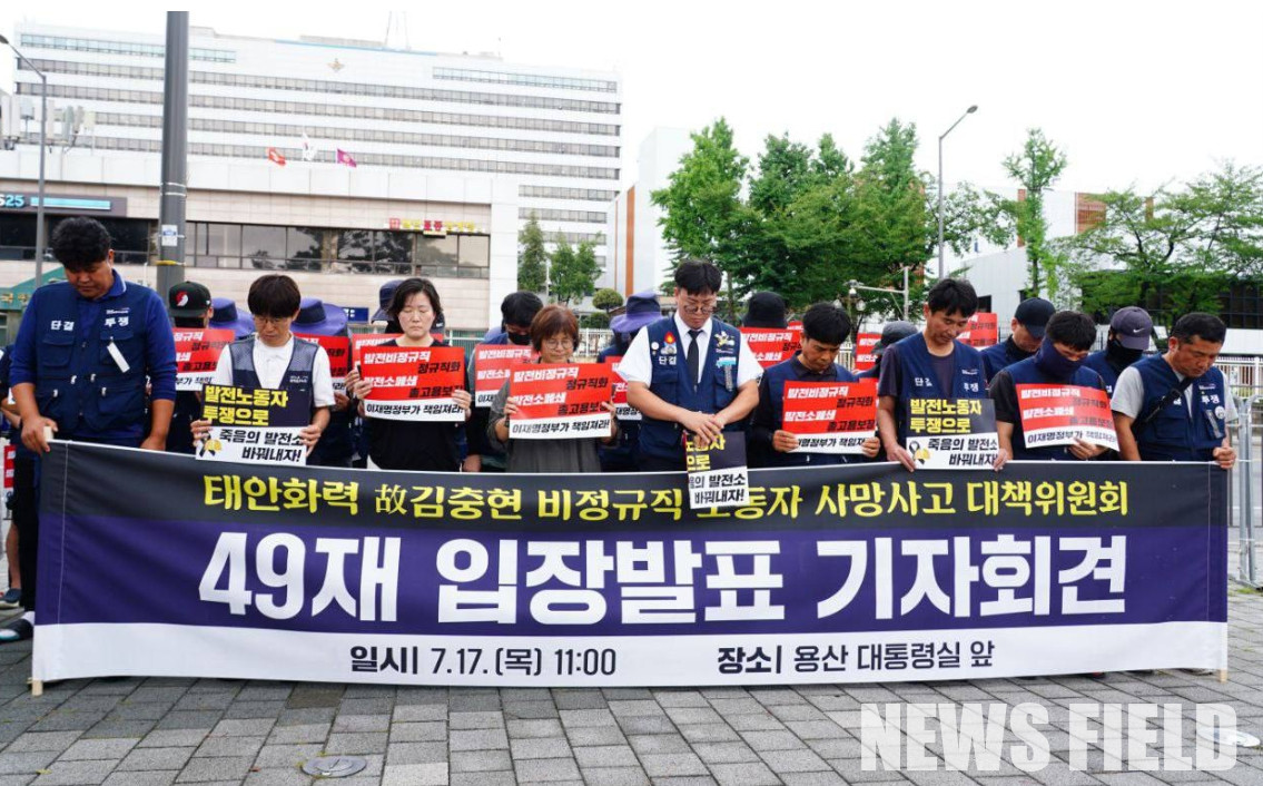 태안화력발전소에서 일하다 숨진 故 김충현 비정규직 노동자의 49재를 사흘 앞둔 7월 17일, 용산 대통령실 앞에서 추모와 함께 정부 책임을 묻는 목소리가 터져 나왔다.
