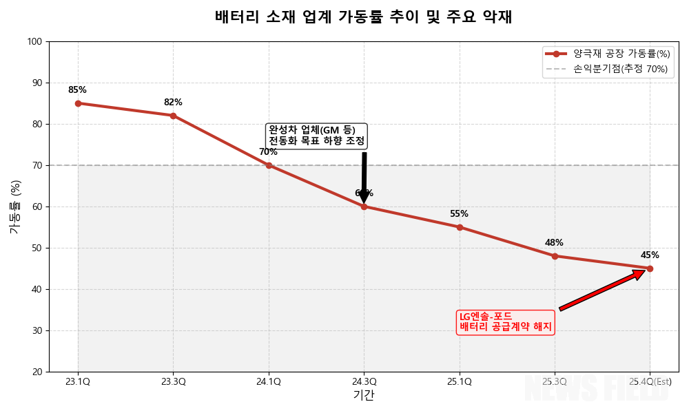 실제로 증권가와 업계 추산에 따르면 지난해 하반기부터 국내 양극재 업체들의 평균 공장 가동률은 40~60% 박스권에 갇힌 상태다. 통상 제조업의 손익분기점 가동률이 70% 안팎임을 고려하면 공장을 돌릴수록 수익성이 악화하는 구조다.