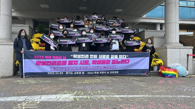 ‘2022 학생저항의 날 공동행동’은 3일 ‘경기도교육감의 학생인권조례 개악 시도 중단, 충남/전북/서울 학생인권조례 폐지 시도 반대’를 요구로 경기도교육청 및 학생인권 반대세력 규탄 집회를 개최했다.