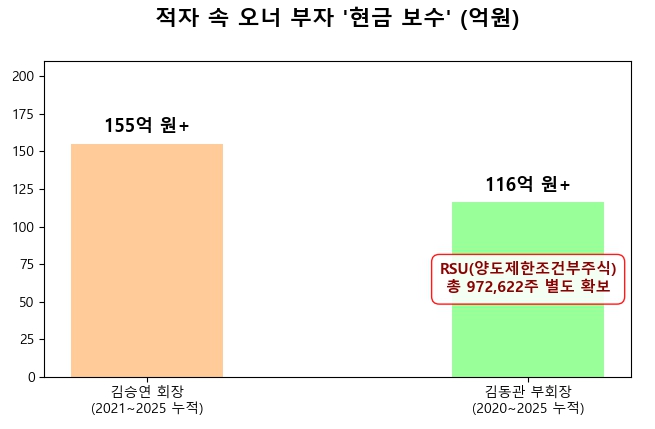 이런 상황에서도 오너 일가는 막대한 현금 보수와 주식 보상을 챙겼다.