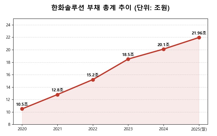 무리한 확장의 결과는 ‘부채 폭발’이었다. 2025년 말 연결 기준 한화솔루션의 총부채는 21조 9,590억 원이라는 경이적인 수치를 기록했다. 실제 갚아야 할 총차입금은 14조 9,773억 원에 달하며, 부채비율은 196.32%까지 치솟아 재무 건전성은 이미 임계치를 넘었다.