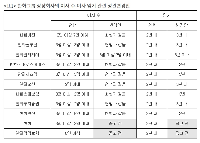 한화 측은 이번 정관변경이 이사회 운영의 연속성과 안정성 강화를 위한 것이라고 설명했다. 하지만 경제개혁연대는 이사의 연임을 통해서도 충분히 안정성을 확보할 수 있다는 점에서 해당 논리가 설득력이 없다고 반박했다. 특히 한화그룹 상장사들이 지난 2016년에는 이사회 운영의 유연성과 책임성 확보를 이유로 이사 임기를 3년에서 2년으로 일제히 단축했던 과거 행보와도 정면으로 배치된다고 지적했다.