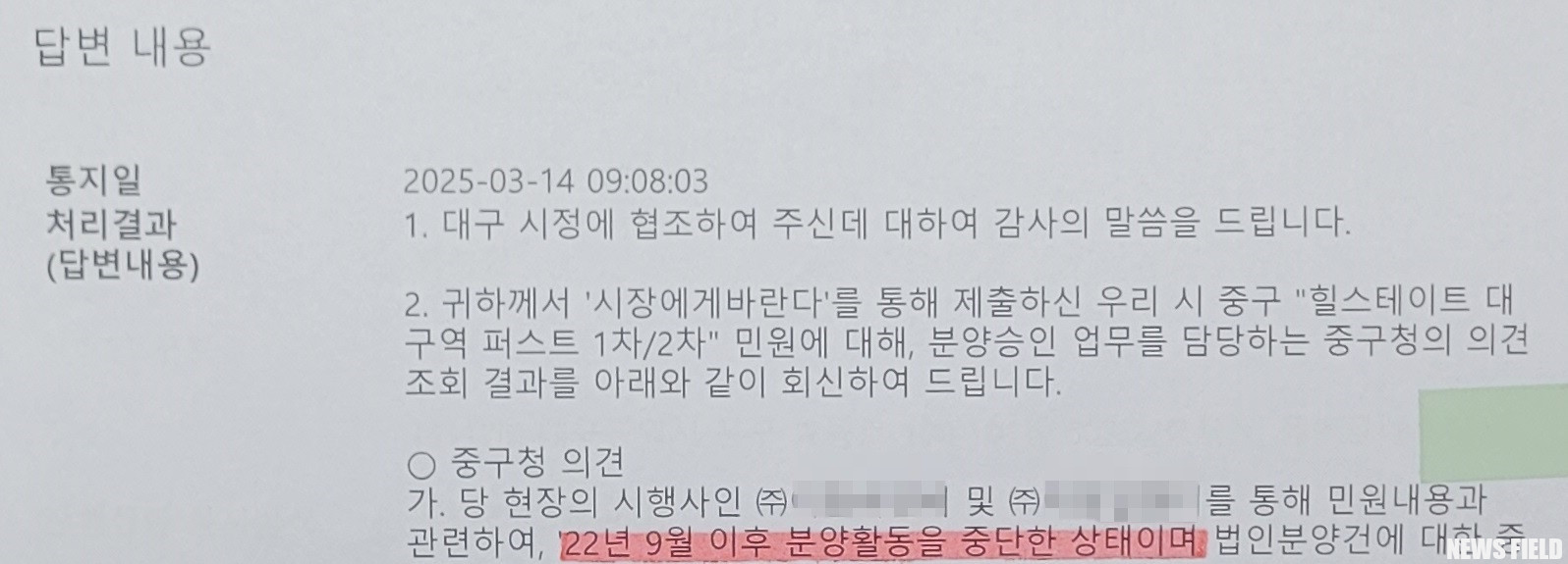 더욱이 현대건설 관계자는 “시행사 담당자 번호는 개인정보라 알려줄 수 없다”며 직접적인 소통 채널 제공에도 난색을 표했다. 대구 중구청에 등록된 시행사 대표번호조차 현재까지 며칠째 전화를 받지 않고 있는 상황에서, 시공사인 현대건설의 이러한 소통 부재는 문제 해결에 대한 의지를 의심케 한다는 지적이 나온다.