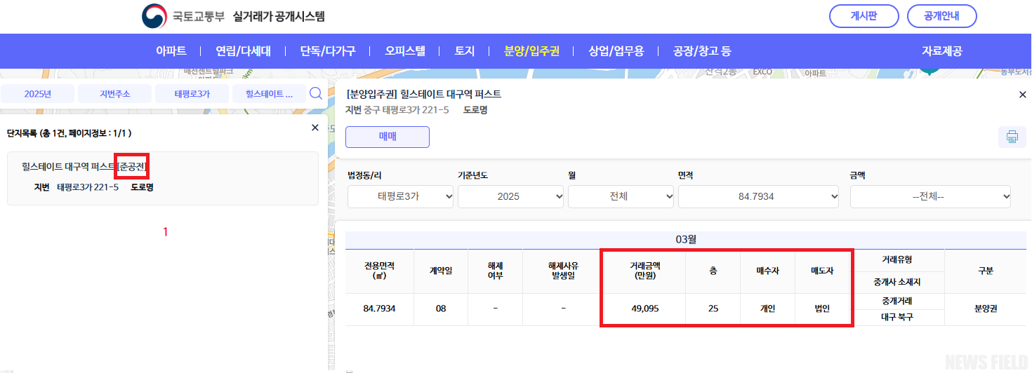 대구 중구청 확인 결과, 시행사는 2022년 9월 이후 사실상 분양 활동을 중단했으며, 준공 전인 2025년 3월 8일(입주 2025. 3. 31) 국토교통부 실거래가 공개시스템에 법인 거래 내역이 등록됐다. ‘힐스테이트 대구역 퍼스트’ 84.7934㎡ (84B 타입) 25층 분양권이 4억 9,095만 원에 거래된 것이다. 이 가격은 기존 분양가 대비 1억 205만 원 낮은 수준이었다. 준공을 앞둔 시점에 단지 내 첫 실거래가로 억대 마피의 법인 매물이 나온 것이다.