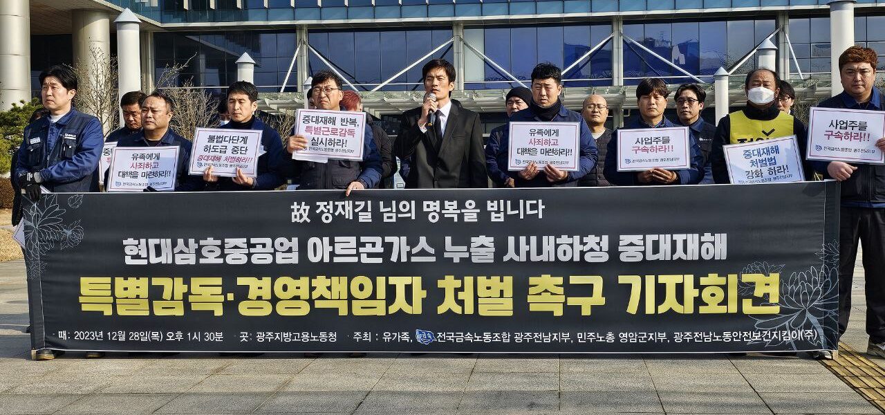 금속노조는 28일 광주지방고용노동청 앞에서 기자회견을 열고 “고용노동부는 이번 사고를 계기로 현대삼호중공업에 대한 특별감독관 안전보건진단을 실시하여 중대재해 예방대책을 수립해야 한다. 또한, 윤석열 정부는 중대재해 처벌법 개악을 중단하고 실효성이 있도록 처벌을 강화하고 모든 사업장에 적용하게 해야 한다. 조선업 다단계하도급 구조 및 위험의 외주화에 대한 근본적 개선대책도 마련해야 할 것이다”고 밝혔다.