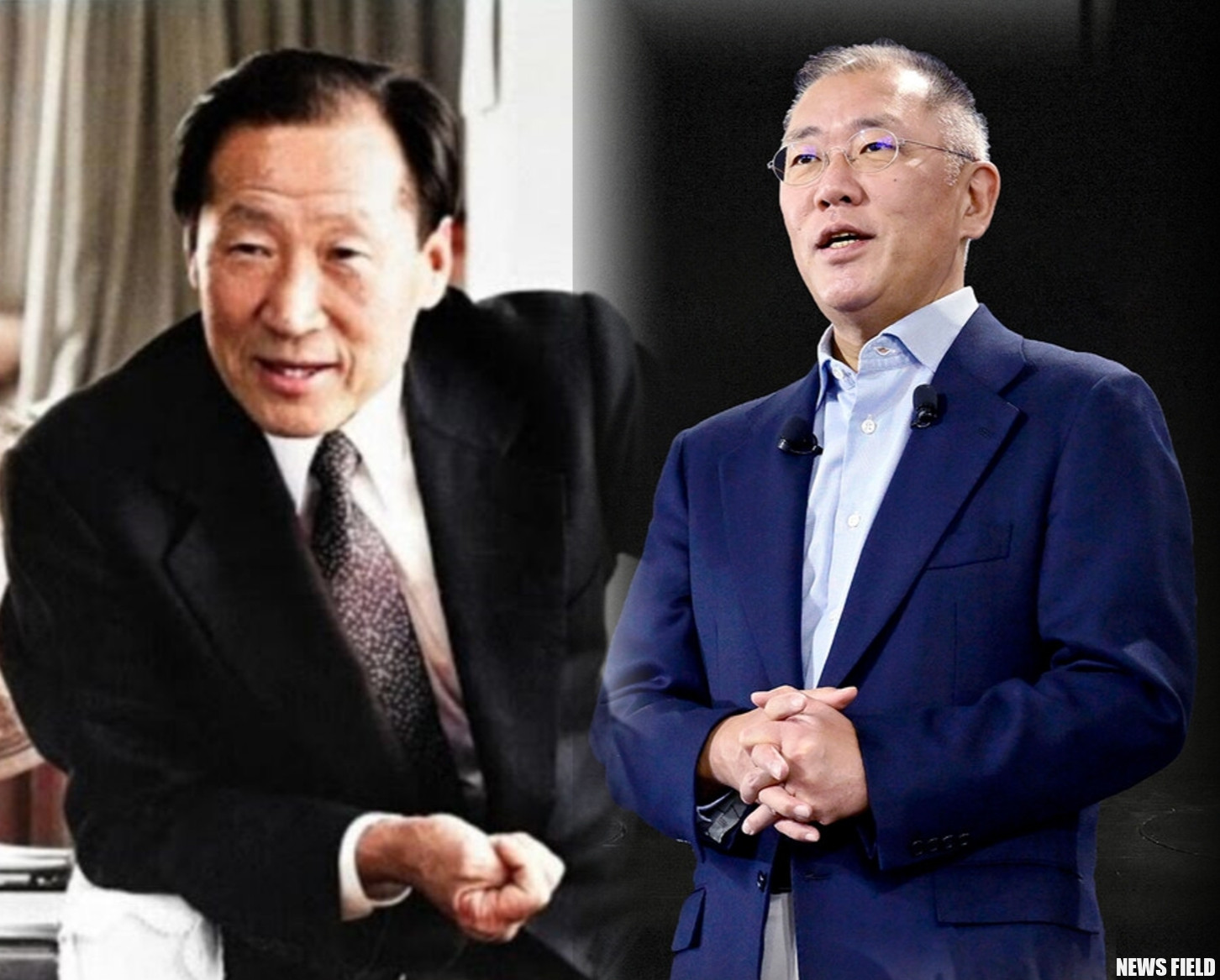 좌측: 현대차그룹의 창업주 정주영 회장. 고객을 위한 희생을 강조하며 직접 현장에서 직원들과 헌신했던 그의 경영 철학은 오늘날 현대차 성장의 밑거름이 됐다.우측: 정주영 회장의 손자이자 현 현대차그룹을 이끄는 정의선 회장. '인류를 향한 진보'를 기치로 미래 모빌리티 시대를 선도하지만, 노동자 35억 원 손해배상 판결로 기업의 사회적 책임에 대한 의문이 제기되고 있다.