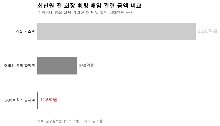 최신원 전 회장이 범죄 당시 저지른 행위는 SK네트웍스 한 곳에 국한되지 않았다. SKC, SK텔레시스 등 6개 계열사 전반을 무대로 2,235억 원 규모의 횡령·배임 혐의가 제기됐고, 대법원이 유죄로 확정한 금액도 약 560억 원에 달했다. 그럼에도 SK네트웍스는 공시에서 자기 회사 피해액(11억 원)만 적시했다.