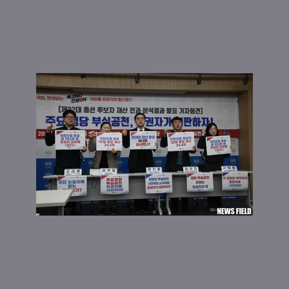 경제정의실천시민연합(경실련)은 28일 경실련 강당에서 기자회견을 열고, 22대 총선 후보자 952명을 대상으로 전과 및 재산 분석 결과를 발표했다. 이날 “후보자 305명(32.0%)이 전과 기록을 보유하고 있으며, 1인당 평균 재산은 24.4억원(부동산 15.7억원, 증권 6.9억원)”이라고 밝혔다.