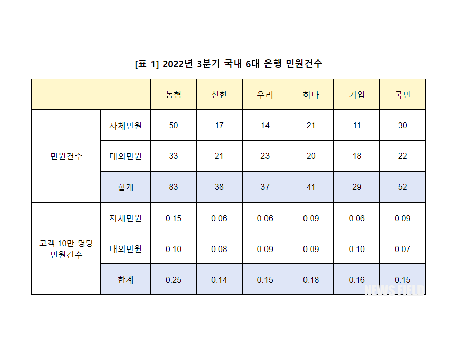 10일 소비자주권시민회의에 따르면 민원은 소비자가 직접 은행에 제기하는 자체민원과 금융당국을 통해 이관되는 대외민원으로 나뉜다. 농협은행은 자체민원과 대외민원 건수가 모두 6대 은행 중 가장 많았고, 민원발생률도 자체민원과 대외민원을 가리지 않고 가장 높았다. 소비자들이 불만사항을 은행에 직접 표출하기도 했지만, 은행의 자체 문제해결을 신뢰하지 않고 금융당국에 문제해결을 요청하는 빈도도 높았다는 뜻이다.