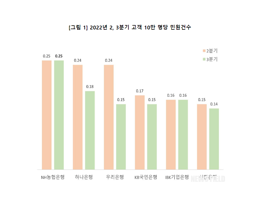 농협은행의 3분기 민원발생률은 2분기에 비해 개선되지 않았다. 농협은행의 2분기 고객 10만 명당 민원건수는 0.25건이었다. 2분기에도 6대 은행 중 가장 높았다. 농협은행의 뒤를 이어 하나은행과 우리은행의 민원발생률이 0.24로 근소한 차이를 보였다. 그러나 3분기에 하나은행과 우리은행이 민원발생률을 크게 줄인 반면, 농협은행은 민원발생률이 줄지 않았다. 소비자의 불편사항을 개선하려는 노력이 보이지 않는다.