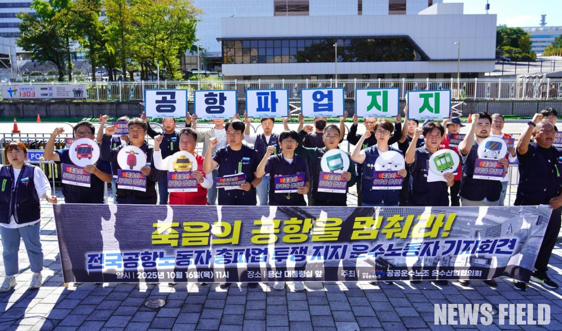 공공운수노조 운수산업협의회는 16일 오전 11시 서울 용산 대통령실 앞에서 기자회견을 열고 전국공항 자회사 노동자들의 총파업에 지지 의사를 표명하며 정부와 공항공사의 책임 있는 자세를 촉구했다.
