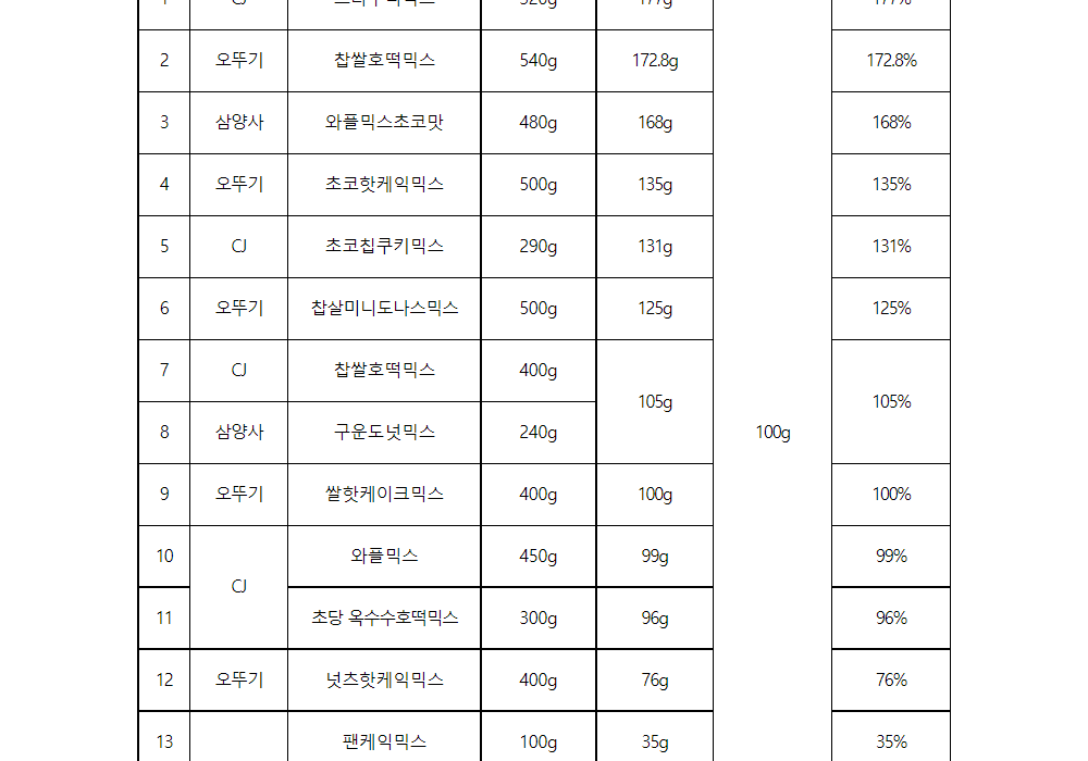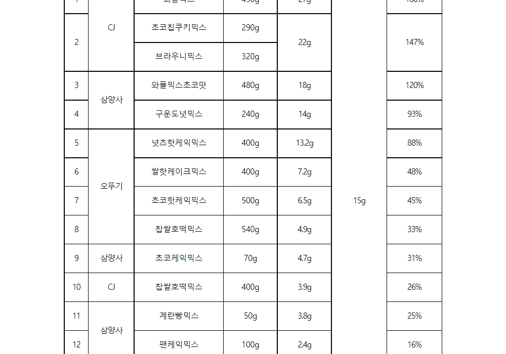 다음으로, 오뚜기 ‘찹쌀호떡믹스’(172.8g), 삼양사 ‘와플믹스초코맛’(168g)이 뒤를 이었다.