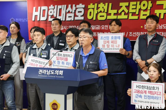 노조는 “HD현대삼호 하청업체가 사내 구조조정을 진행하면서 짜인 각본대로 금속노조 전남조선하청지회 지회장과 부지회장 등 2명을 콕 집어 해고했다”며 “이들 노조 간부에 대한 해고는 명백한 노조활동 탄압이며, 이는 근로자의 헌법적 권리인 노조할 권리를 심각하게 침해하는 행위다”라고 주장했다.