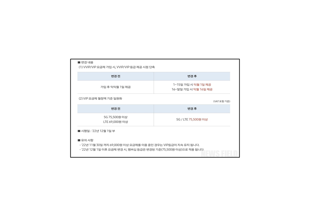 이번에도 VIP요금제 등급 적용 시점을 앞당기고, 기존 VIP요금제 기준을 월 69,000원에서 월 75,500원으로 높였다.