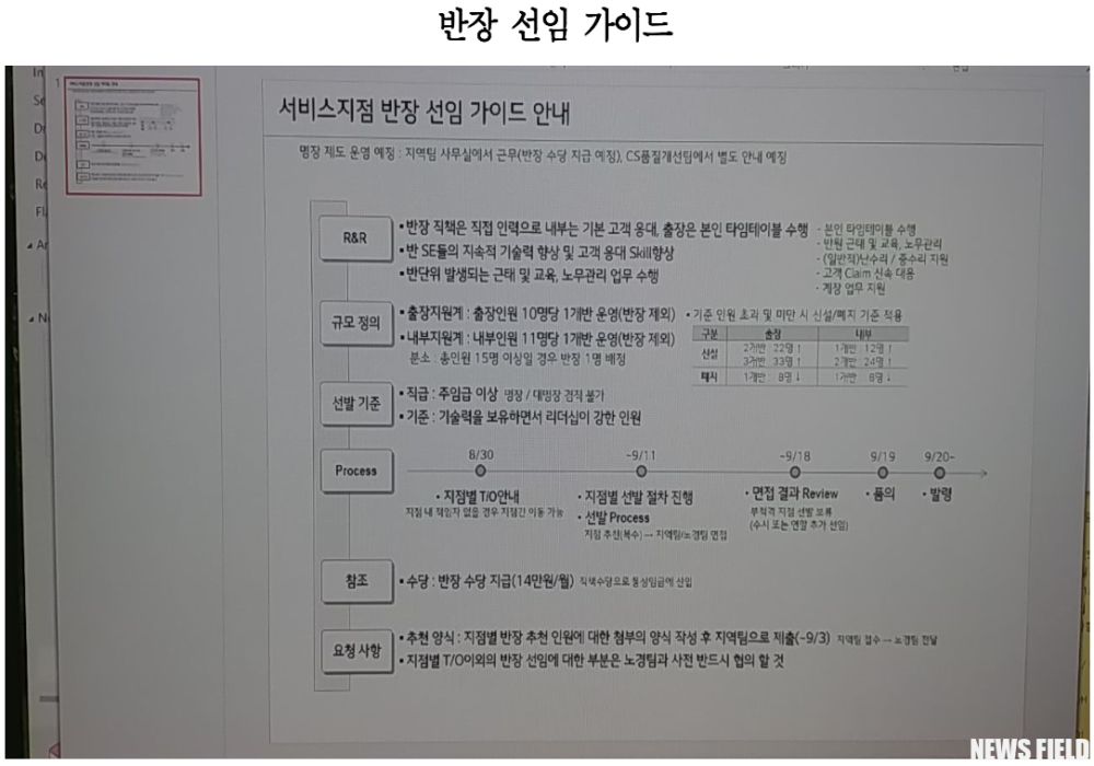 문제는 2022년 6월 기준 LG전자 서비스센터 총 93개 지점(분소 제외) 중 관리직에 해당하는 지점장 93명, 실장 165명, 반장 221명이 있다. 그런데 그중 민주노총 산하 금속노조 LG전자지회 인원은 0명이다.